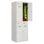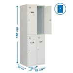 Taquilla metálica de 2 cuerpos con 4 puertas de color gris. Las dimensiones son 1800x600x500 mms. Se entrega montado e incluye un estante, perchero, una cerradura, respiradero y etiquetero para mayor comodidad del usuario.