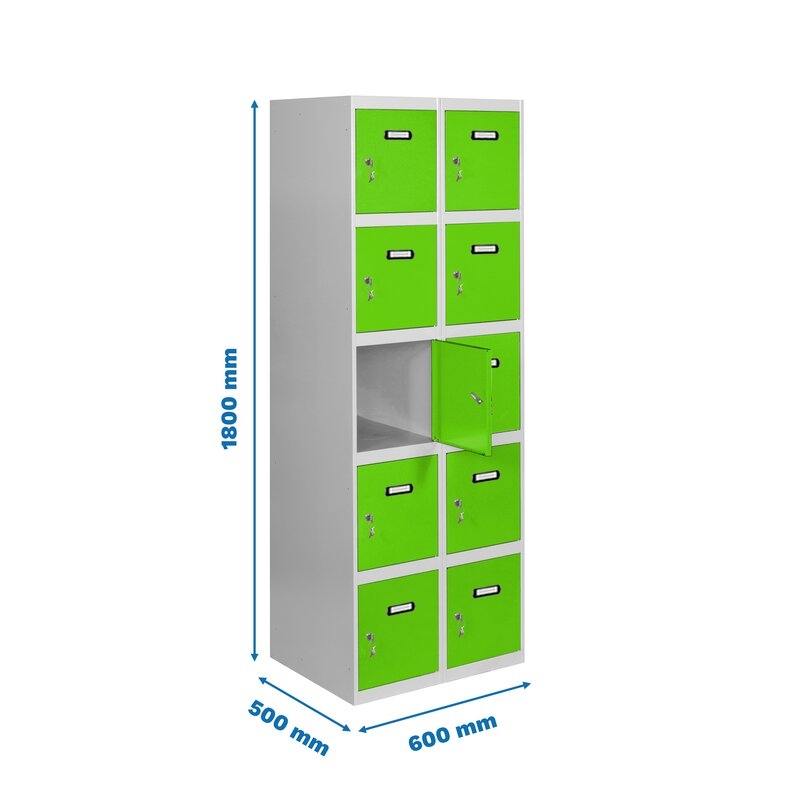 Casillero metálico de 2 cuerpos con 10 puertas de color gris y las puertas verdes. Las dimensiones son 1800x600x500 mms.
