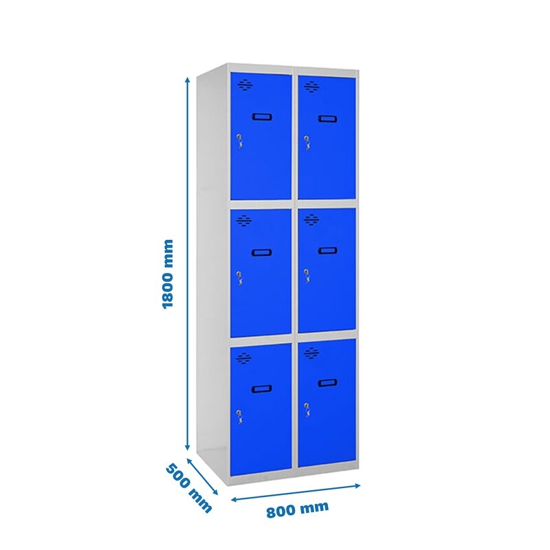 Casillero metálico de 2 cuerpos con 6 puertas de color gris y las puertas azules. Las dimensiones son 1800x800x500 mms.