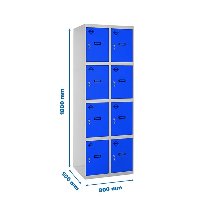 Casillero metálico de 2 cuerpos con 8 puertas de color gris y las puertas azules. Las dimensiones son 1800x800x500 mms.
