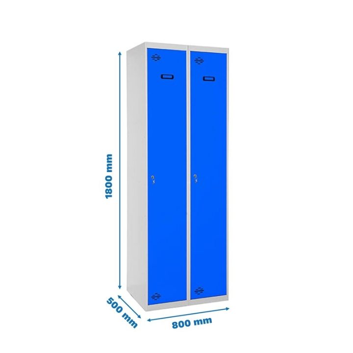 Taquilla metálica de 2 cuerpos con 2 puertas de color gris y las puertas azules. Las dimensiones son 1800x800x500 mms.