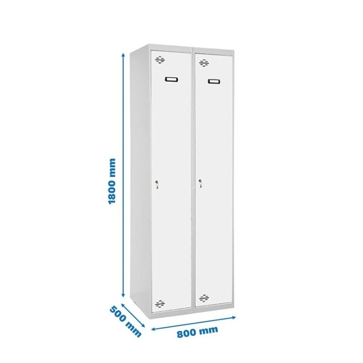 Taquilla metálica de 2 cuerpos con 2 puertas de color gris y las puertas blancas. Las dimensiones son 1800x800x500 mms.