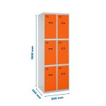 Casillero metálico de 2 cuerpos con 6 puertas de color gris y las puertas naranjas. Las dimensiones son 1800x800x500 mms.