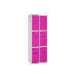 Casillero metálico de 2 cuerpos con 6 puertas de color gris y las puertas rosas. Las dimensiones son 1800x800x500 mms.
