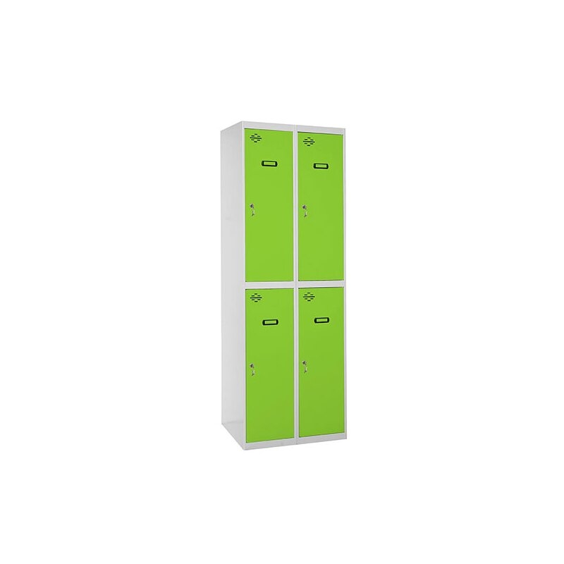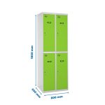 Taquilla metálica de 2 cuerpos con 4 puertas de color gris y las puertas verdes. Las dimensiones son 1800x800x500 mms.