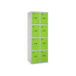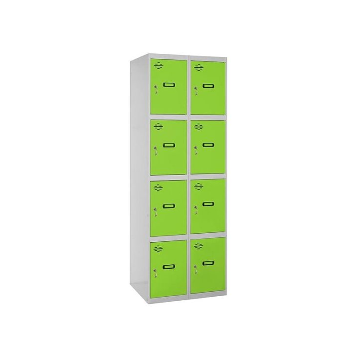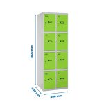 Casillero metálico de 2 cuerpos con 8 puertas de color gris y las puertas verdes. Las dimensiones son 1800x800x500 mms.