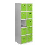 Casillero metálico de 2 cuerpos con 10 puertas de color gris y las puertas verdes. Las dimensiones son 1800x800x500 mms.