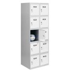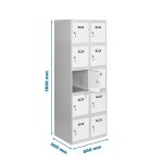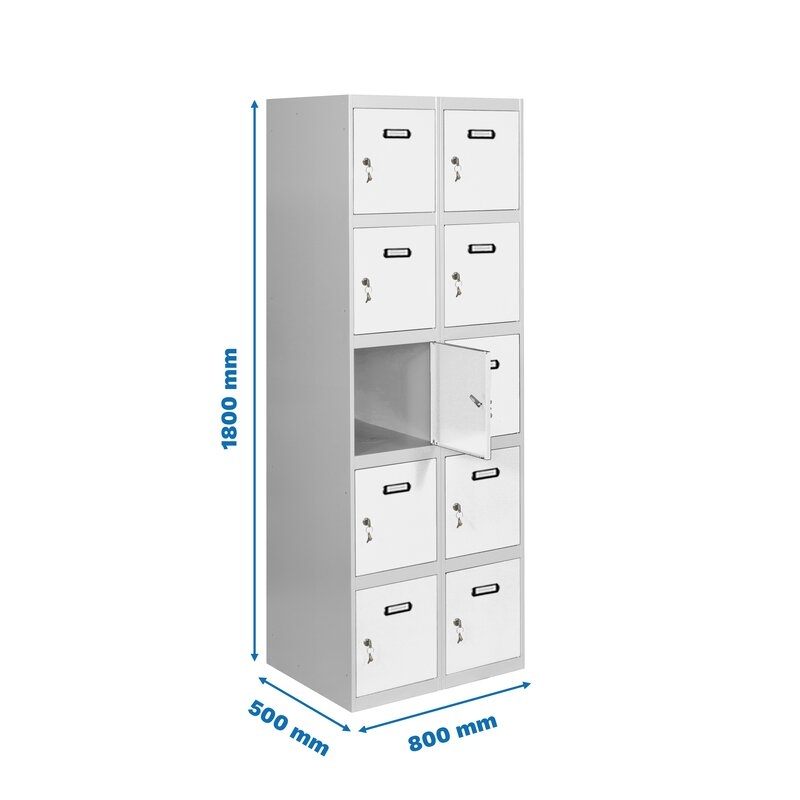 Casillero metálico de 2 cuerpos con 10 puertas de color gris y las puertas blancas. Las dimensiones son 1800x800x500 mms.