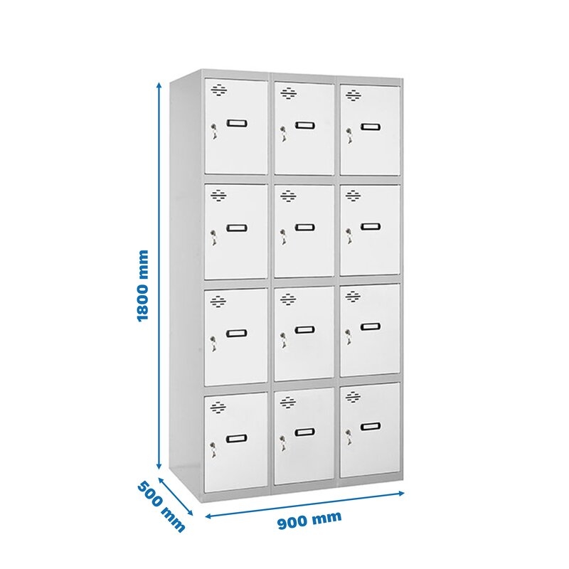 Casillero metálico de 3 cuerpos con 12 puertas de color gris y las puertas blancas. Las dimensiones son 1800x900x500 mms.