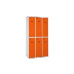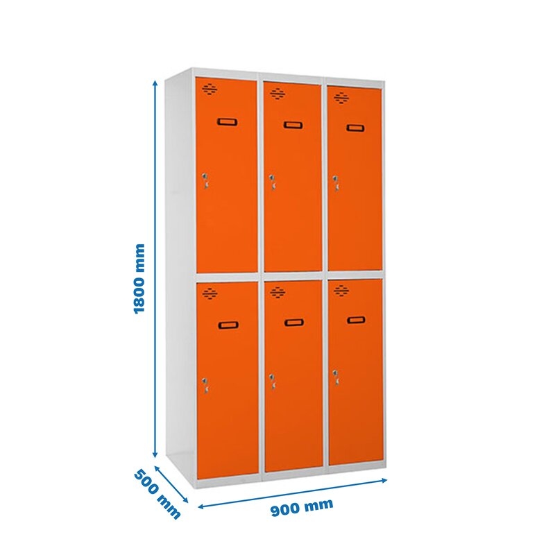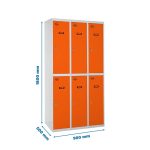 Taquilla metálica de 3 cuerpos con 6 puertas de color gris y las puertas naranjas. Las dimensiones son 1800x900x500 mms.