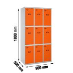 Casillero metálico de 3 cuerpos con 9 puertas de color gris y las puertas naranjas. Las dimensiones son 1800x900x500 mms.