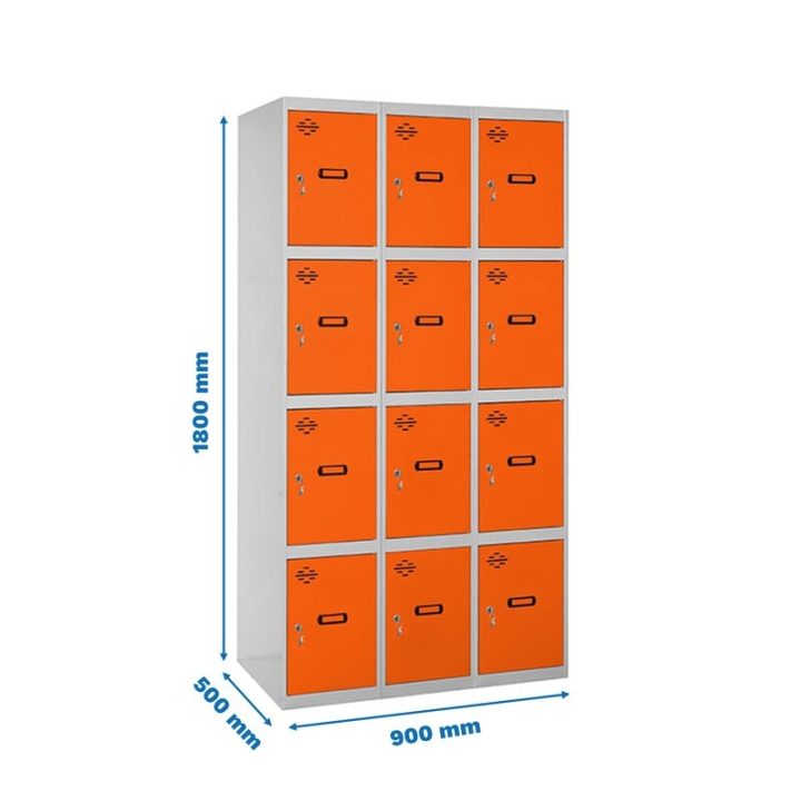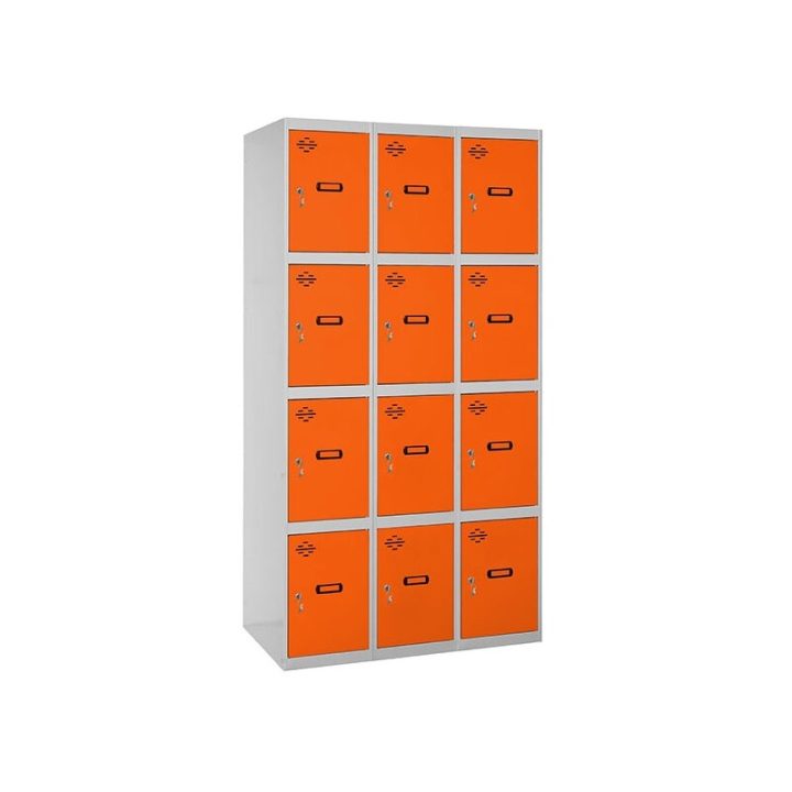 Casillero metálico de 3 cuerpos con 12 puertas de color gris y las puertas naranjas. Las dimensiones son 1800x900x500 mms.