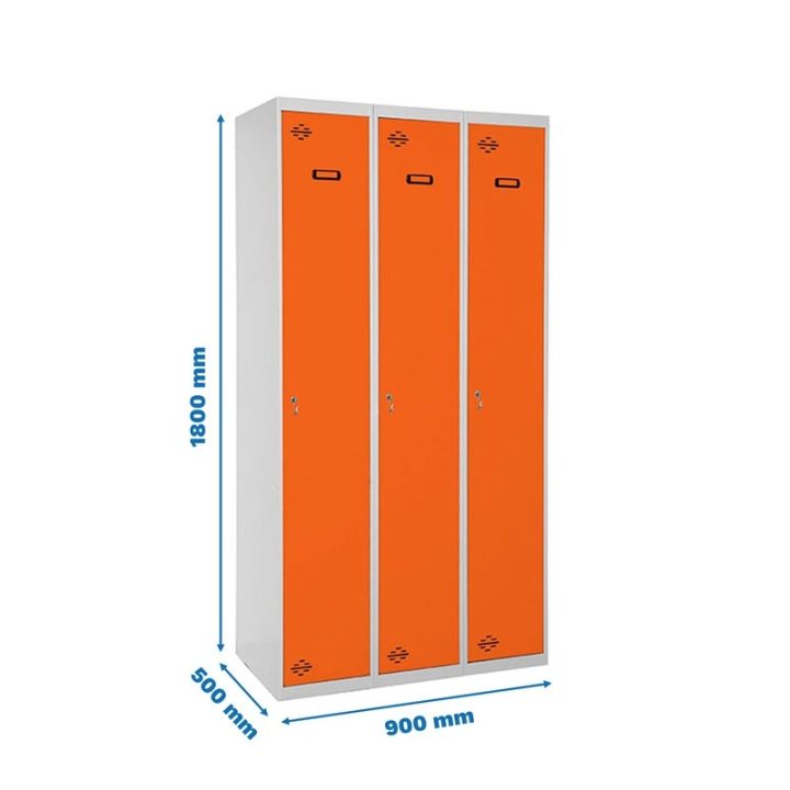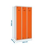 Taquilla metálica de 3 cuerpos con 3 puertas de color gris y las puertas naranjas. Las dimensiones son 1800x900x500 mms.