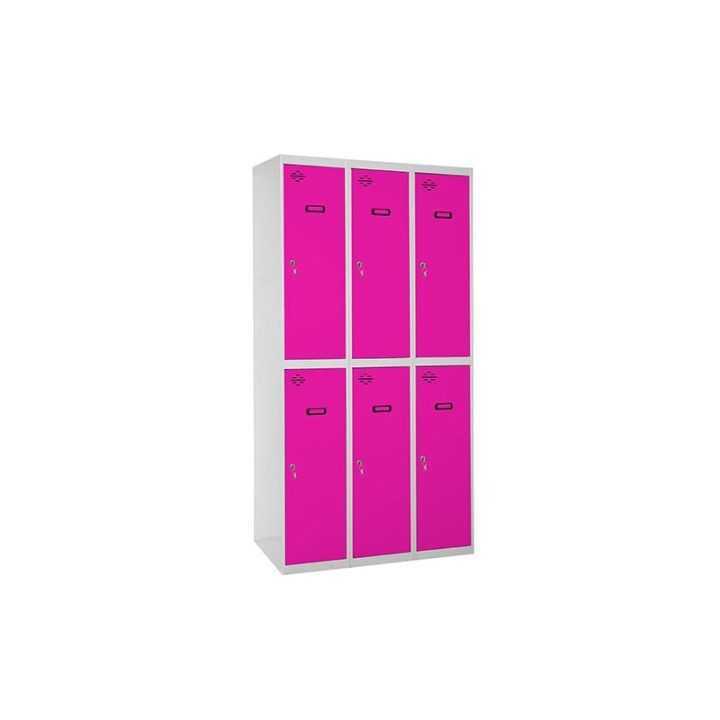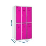Taquilla metálica de 3 cuerpos con 6 puertas de color gris y las puertas rosas. Las dimensiones son 1800x900x500 mms.