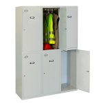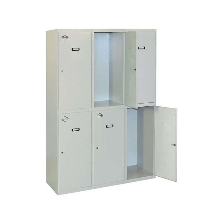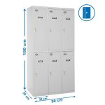 Taquilla metálica de 3 cuerpos con 6 puertas de color gris. Las dimensiones son 1800x900x500 mms. Se entrega montado e incluye un estante, perchero, una cerradura, respiradero y etiquetero para mayor comodidad del usuario.