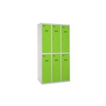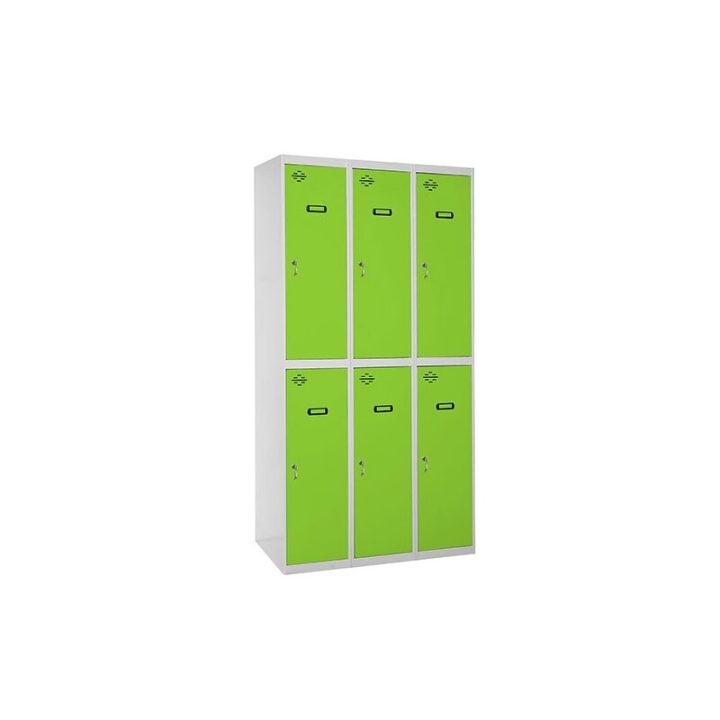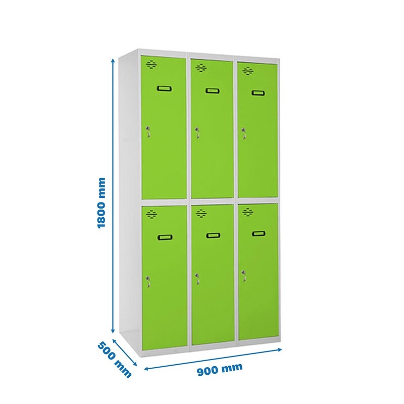 Taquilla metálica de 3 cuerpos con 6 puertas de color gris y las puertas verdes. Las dimensiones son 1800x900x500 mms.