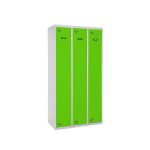 Taquilla metálica de 3 cuerpos con 3 puertas de color gris y las puertas verdes. Las dimensiones son 1800x900x500 mms.
