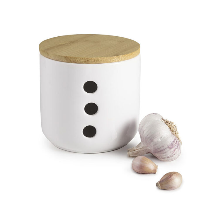 Este elegante tarro está fabricado en cerámica dispone de tapa en bamboo. El tarro tiene perforado 3 agujeros para que entre aire para una conservación optima de los ajos. Tiene un diámetro de 12 cm.