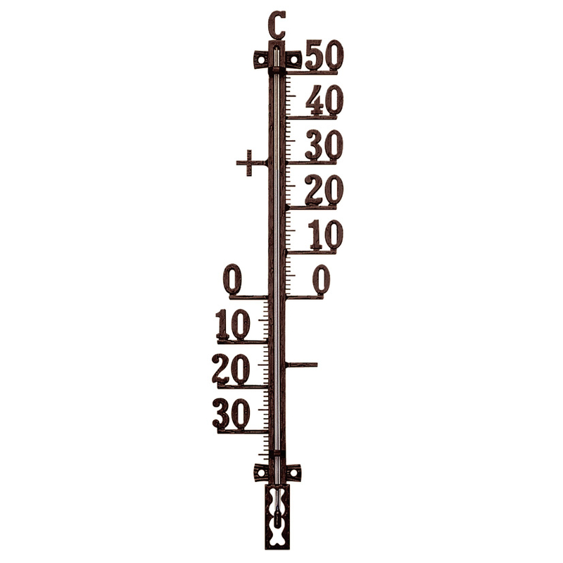 Este original termómetro está fabricado en metal antiguo con unas medidas de 275 mm. Está diseñado especialmente para zonas exteriores, son más resistentes y de gran durabilidad. Además, medirá correctamente la temperatura exterior de una forma precisa. Se presenta en un blíster.