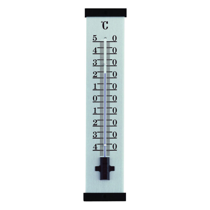 El termómetro está fabricado en aluminio con unas medidas de 55×250 mm. Señala la temperatura máxima y mínima del lugar donde se encuentra mediante un líquido interno ecológico. De fácil visualización gracias a sus dígitos de gran tamaño. Se presenta en un blíster.