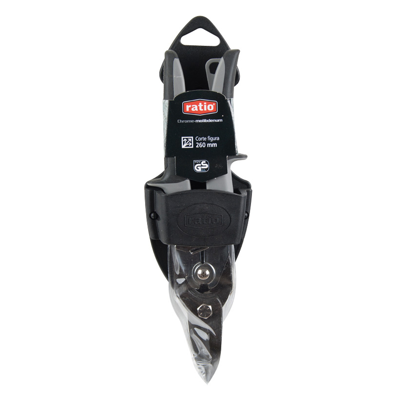 Esta tijera de corte figura de 260 mm cuenta con bocas forjadas en acero cromo-molibdeno pavonado, filo dentado templado con dureza 60-62 HRc y ofrece una longitud de corte de 38 mm (acero laminado 1,5 mm/ acero inoxidable 0,9 mm/ cobre 1,8 mm). Incluye un mango bimaterial antideslizante para que trabajes con mayor confort y eficacia, así como una funda plástica para cinturón, con la que podrás transportarla fácilmente. Homologación TÜV/GS.
