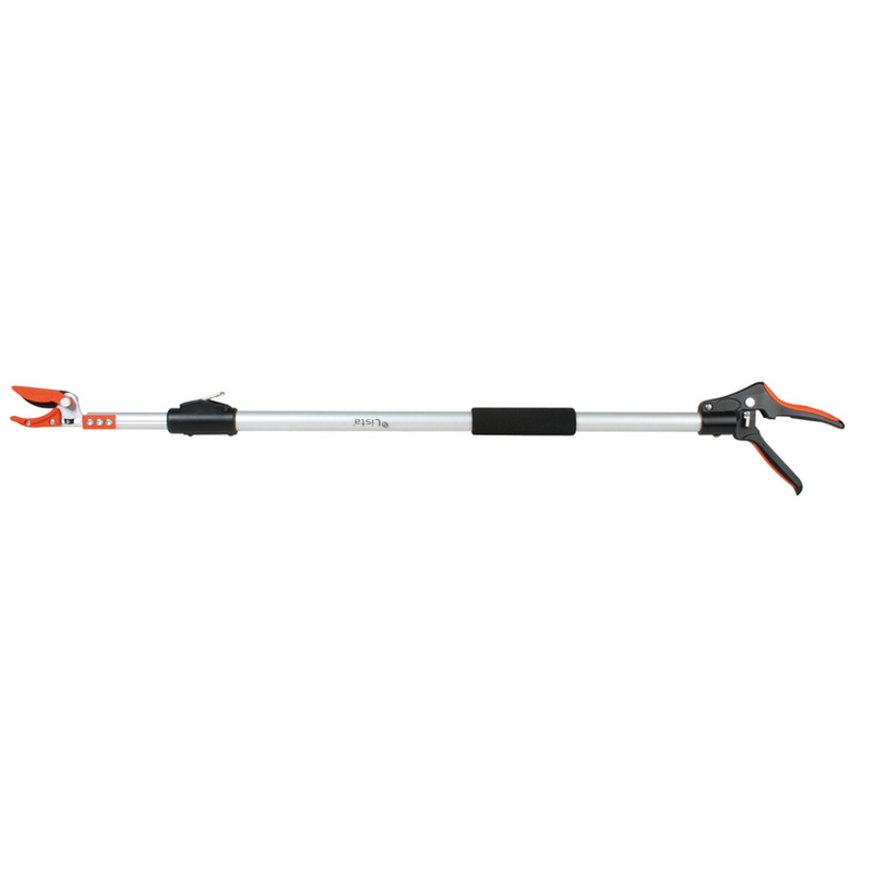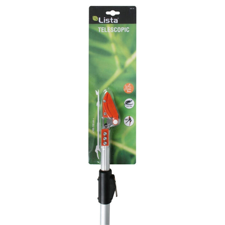 Es una tijera para podar con un mango extensible que puede alcanzar una longitud de 150 cm para podar ramas altas y tiene 5 posiciones de ajuste cada 12.5 cm. Su diámetro de corte es de 8 mm y puedes podar ramas verdes y secas. La cuchilla cortante está fabricada en acero SK5 con un revestimiento antiadherente que facilita el corte y evita su oxidación. El mango es ergonómico que gira hasta 180 grados. Incluye una pinza sujetaflores y se puede desmontar fácilmente. Se presenta en un blíster.