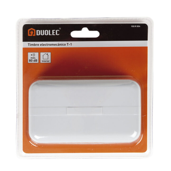 El timbre inalámbrico DUOLEC T1 está equipado por una tapa blanca y una base en color negro. Su instalación es sobre superficie. Tiene una potencia de sonido de 80 dB y unas medidas de 13 5x5xh.8cm. Se presenta en un blíster y tiene 3 años de garantía.