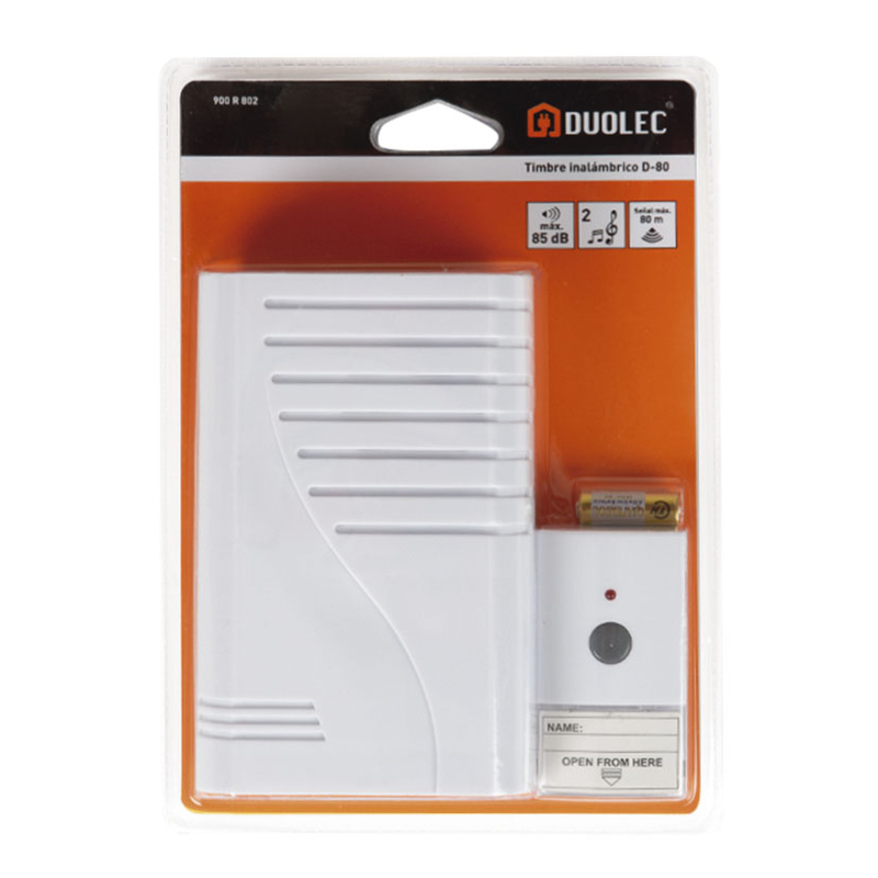 El timbre inalámbrico DUOLEC D-80 está compuesto por 2 partes: el emisor donde se incluye el pulsador y la base que emite el sonido. Tiene un alcance de señal de 80 m2 sin obstáculos. Podrás seleccionar una de las 2 melodías que lleva programadas. Funciona con 3 pilas LR14 C no incluidas y el emisor con 1 pila de 12V/A23 incluidas. Lo podrás instalar tú mismo donde precises gracias a su fácil instalación. Se presenta en un blíster y tiene 3 años de garantía.
