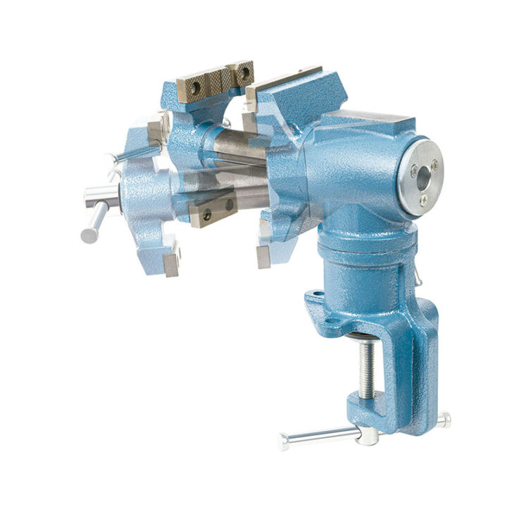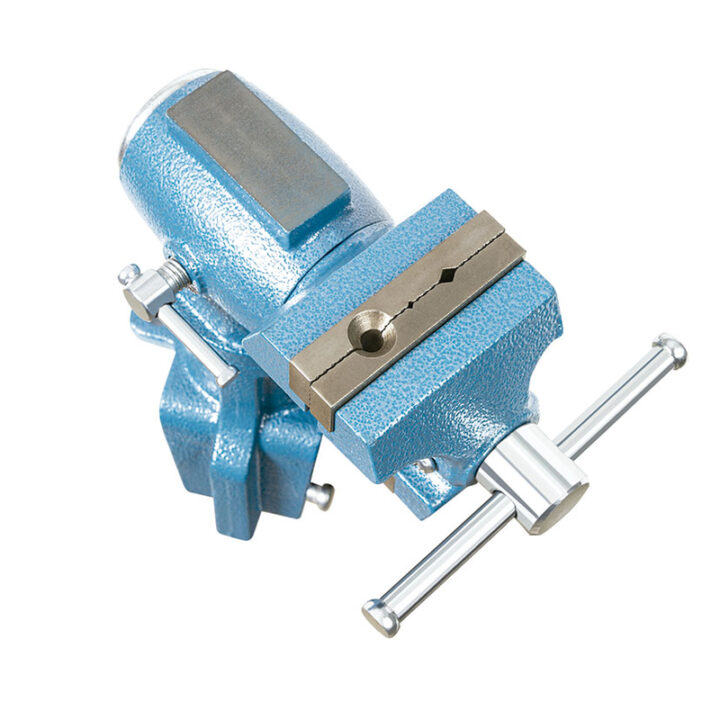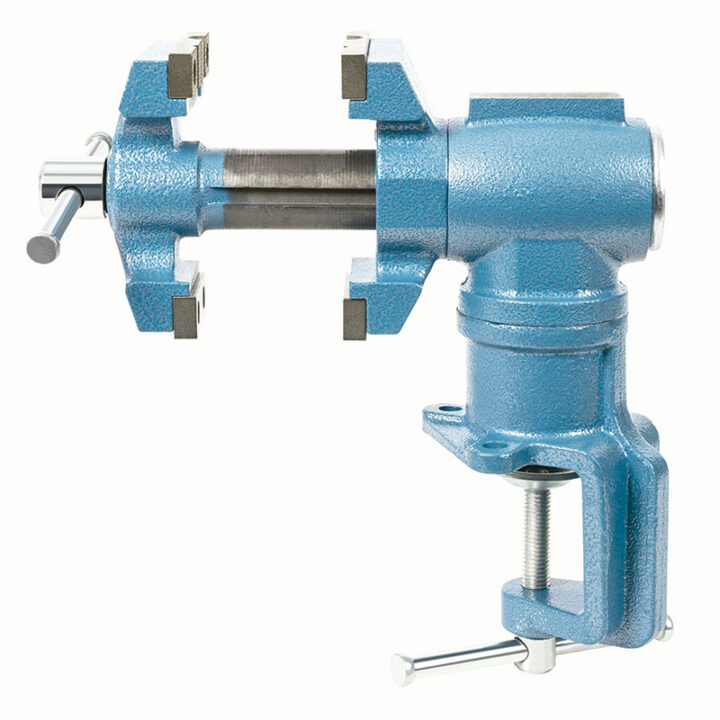 Cuerpo hierro fundido. Tornillo y mango acero. Doble mordaza. Giratorio 360º. Con plataforma de yunque.