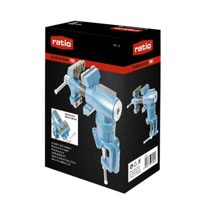 Tornillo de banco RATIO 7963. Herramienta de sujeción imprescindible en cualquier taller e ideal para fijar piezas y poder trabajar sobre ellas. Robusto, funcional y fácil de manejar, el tornillo de banco de sobremesa RATIO se caracteriza por su doble mordaza de sujeción, giratorio 360º con plataforma de yunque. Dispone de abrazadera de tipo G para banco. Su cuerpo está fabricado en hierro fundido, lo que garantiza una excelente calidad y durabilidad del producto. Tiene 50 mm de apertura, sujeción de piezas redondas o cuadradas. Viene presentado en una caja.