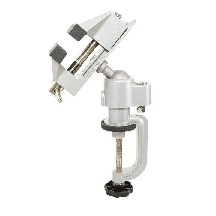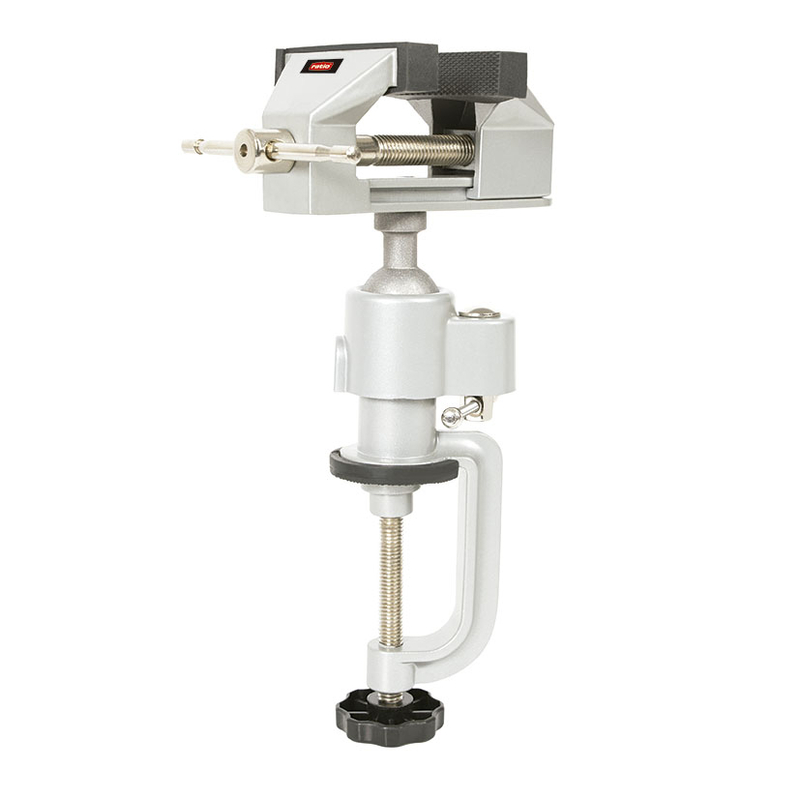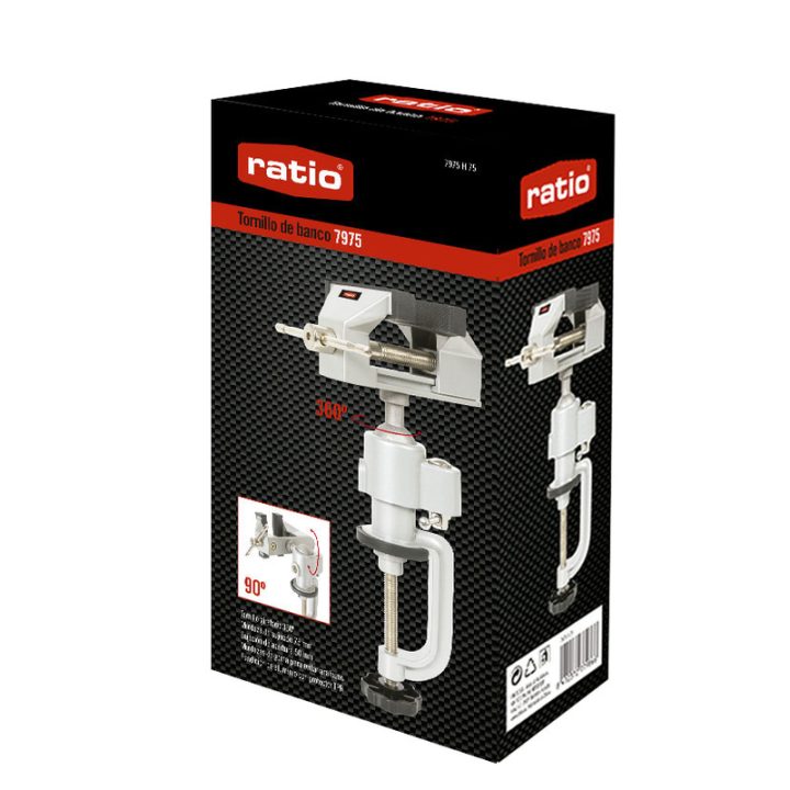 Este tornillo de banco RATIO giratorio 360º e inclinable 90º. Está fabricado en fundición de aluminio con protector TPR. Se puede montar fácilmente en un banco de trabajo u otras superficies para un uso estable. Con rosca que permite adaptar el tramo a la pieza de trabajo. Las mordazas son de goma para evitar arañazos y tienen una sujeción de 75 mm.