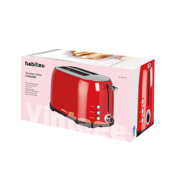 El tostador HABITEX de la serie Vintage tiene un diseño refinado y retro con acabados cromados. Tiene una capacidad para tostar 2 rebanadas de pan. Una vez selecciones uno de los 7 niveles de tostado la rebanada se expulsará automáticamente. Además, dispone de 3 funciones: descongelación, recalentado y cancelación. Así como, bandeja recogemigas para una buena limpieza y alojamiento para el cable. La podrás combinar con diferentes pequeños electrodomésticos de esta misma línea dándole un toque Vintage a tu cocina Tiene 3 años de garantía y viene presentado en una caja.