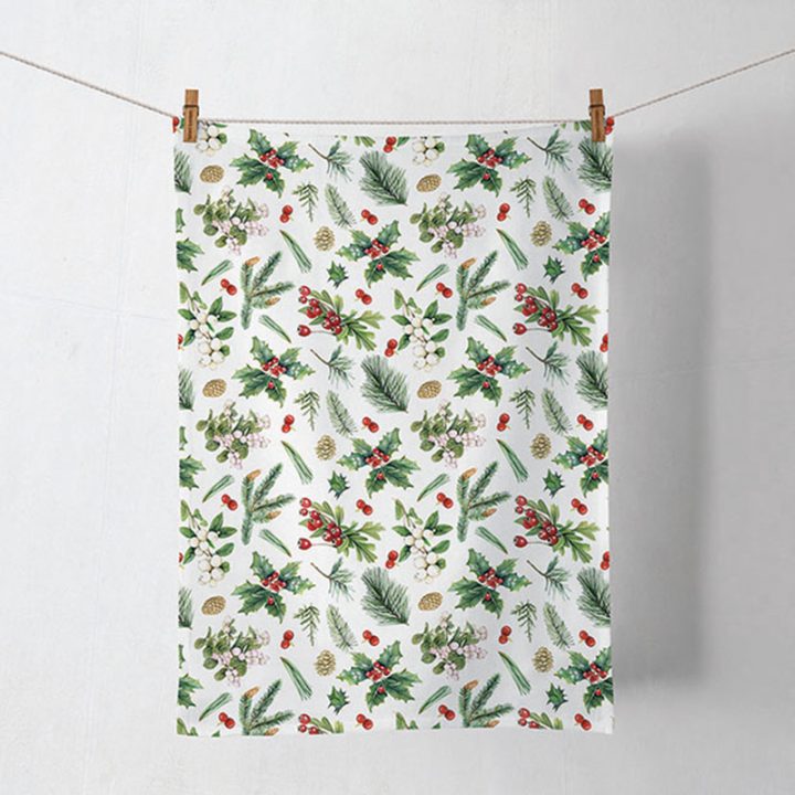 Este trapo o paño de cocina está elabarodo en tela 100% algodón decorado con plantas y frutos de invierno típicos de navidad. Puedes combinarlo con más productos de la misma serie.