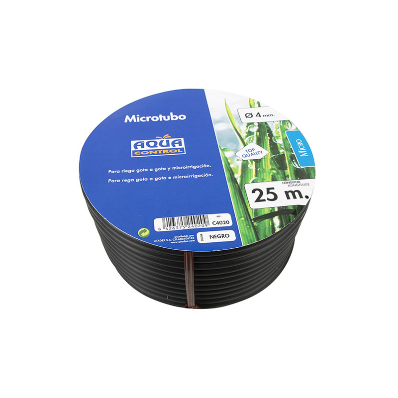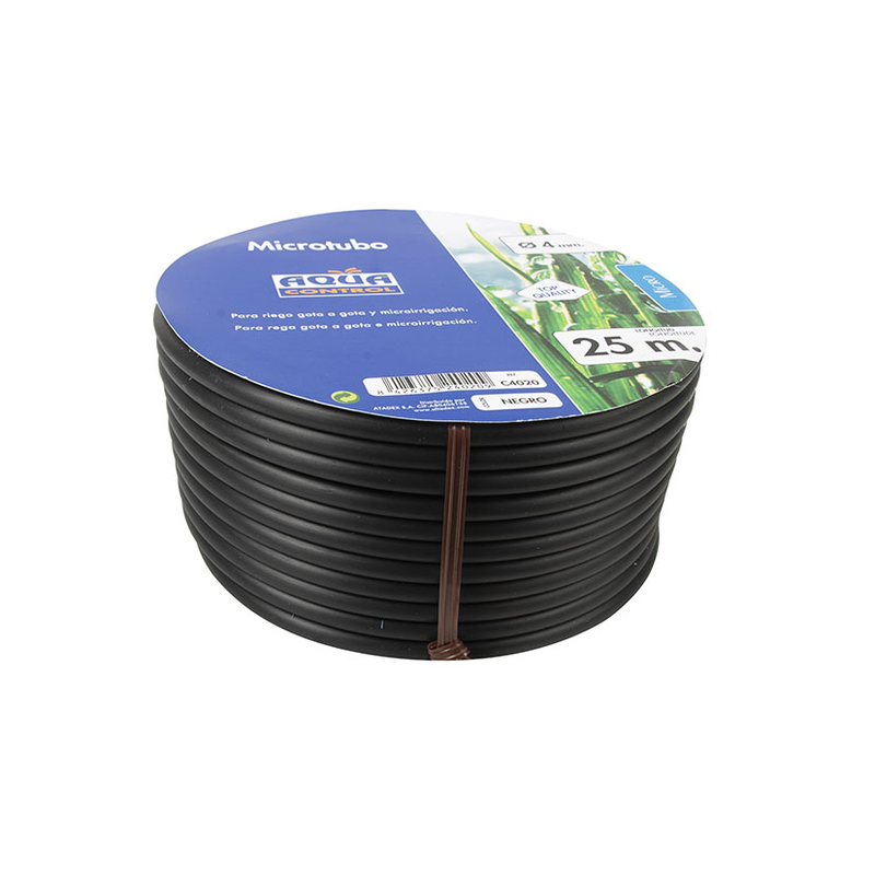 Tubería microtubo fabricada en polietileno en color negro para sistema de riego por goteo, que se basa en el aporte continuo de agua sobre la superficie del suelo (riego superficial), de manera que solo se moja una parte del suelo, la más próxima a la planta.