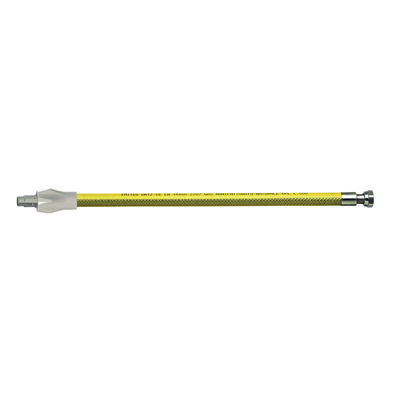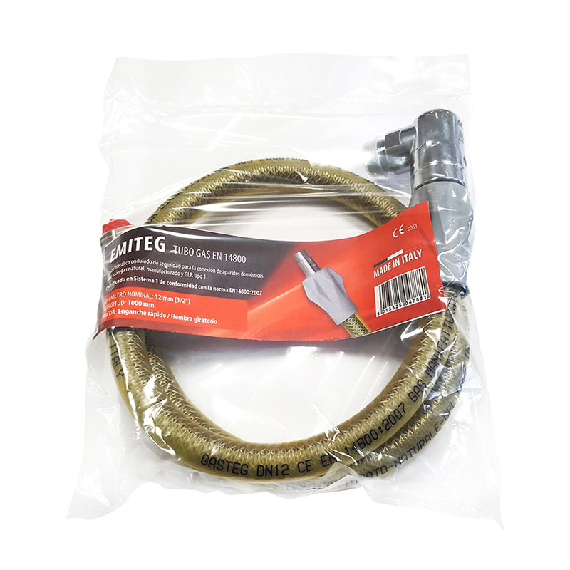 Este tubo de conexión a gas está fabricado en acero inoxidable austenítico AISI 316L y está forrado en PVC ignífugo de color amarillo. Dispone de una válvula de seguridad de gas EN 15069 más un dispositivo de seguridad de activación térmica. Cumple con la normativa UNE EN14800:2007. Viene presentado en una bolsa.