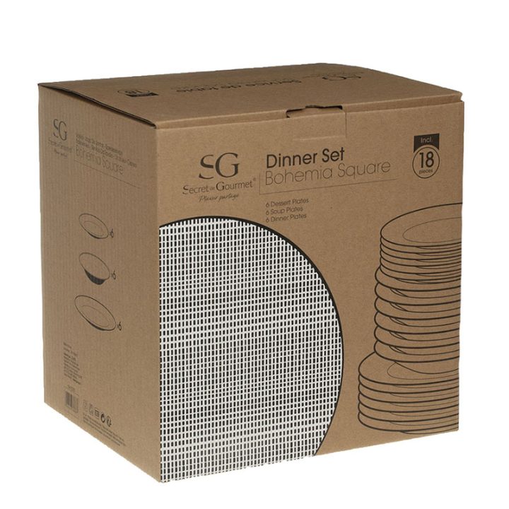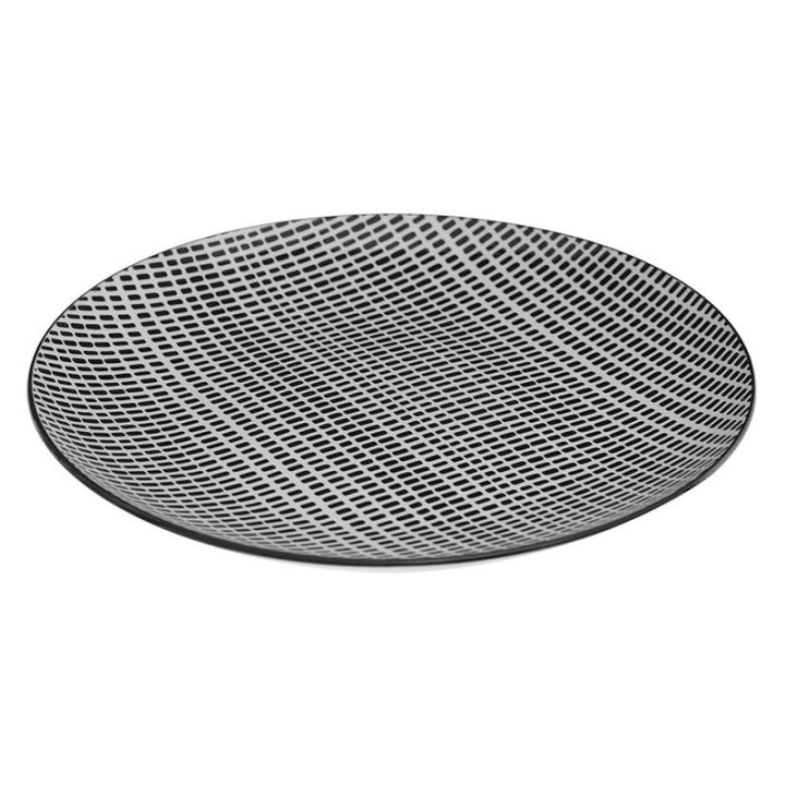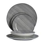 Esta vajilla está fabricada en porcelana Fina y ligera, resistente a los golpes. Su diseño decorado con rayas entrecruzadas en blanco sobre fondo negro, le dan un toque elegante a la mesa. Se compone por 18 piezas: 6 platos hondos de 20,3 cm, 6 platos llanos de 26,8 cm y 6 platos de postre de 19 cm. Además, es apta para el microondas y la podrás lavar en el lavavajillas.