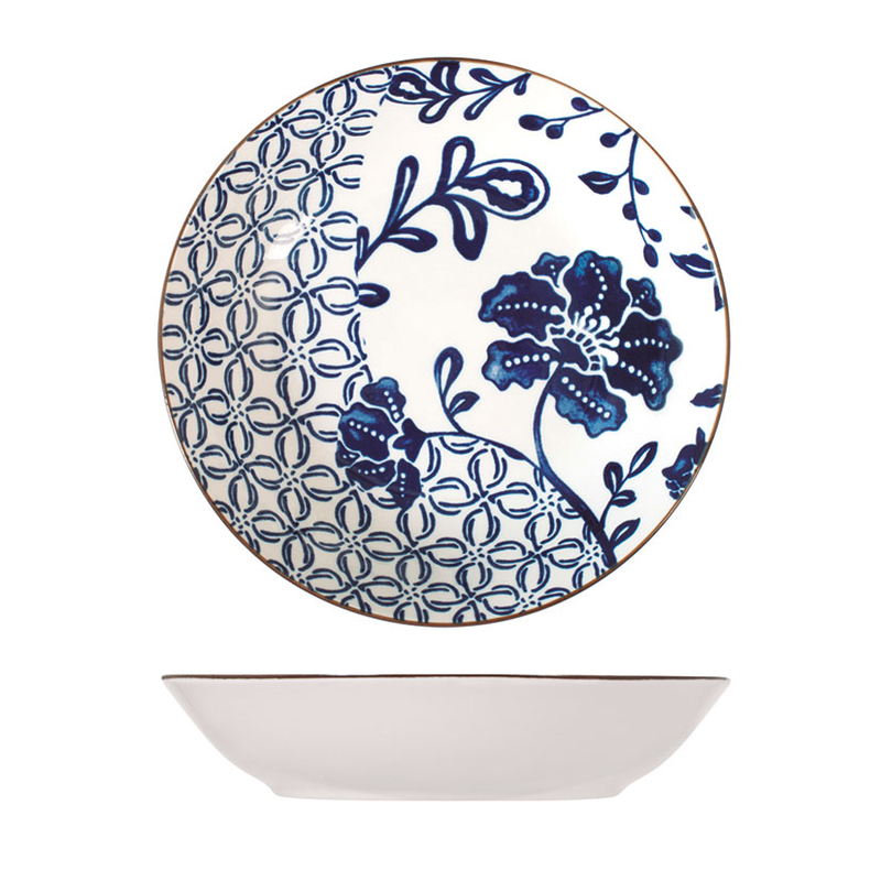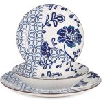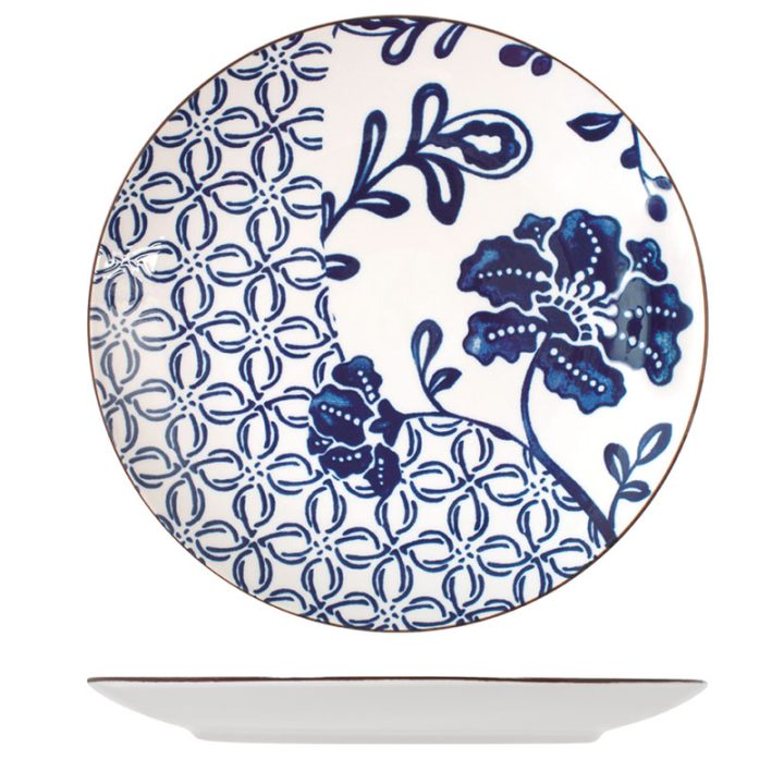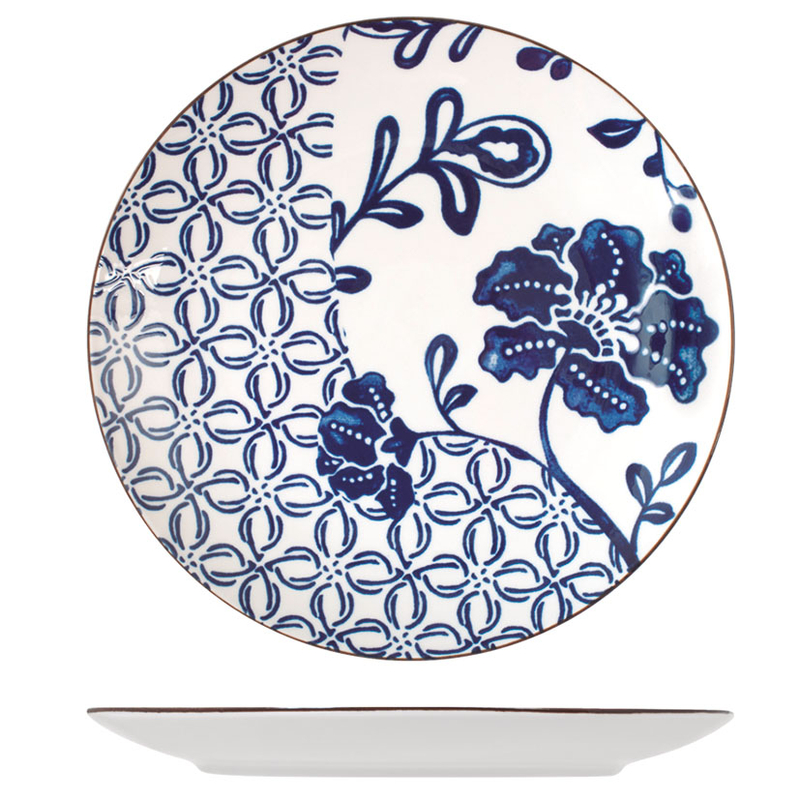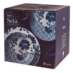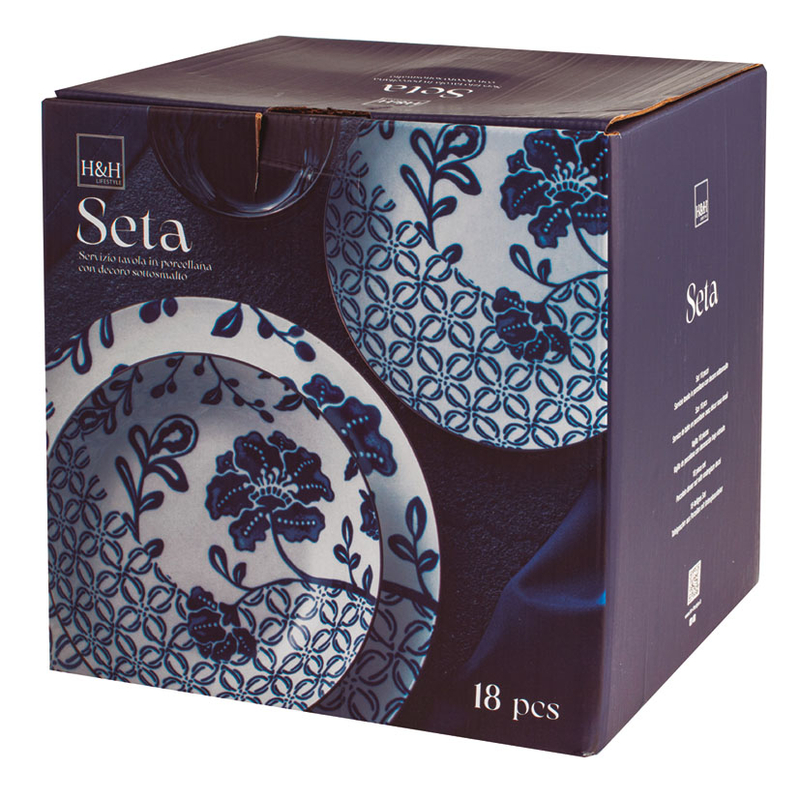Esta vajilla está fabricada en porcelana blanca decorada en tonos azules. Está compuesta por 18 piezas: 6 platos llanos de ø 25cm, 6 platos hondos de ø 20cm y 6 platos de postre de ø 29cm. Viene presentada en una caja. Apta tanto para lavavajillas como para microondas.