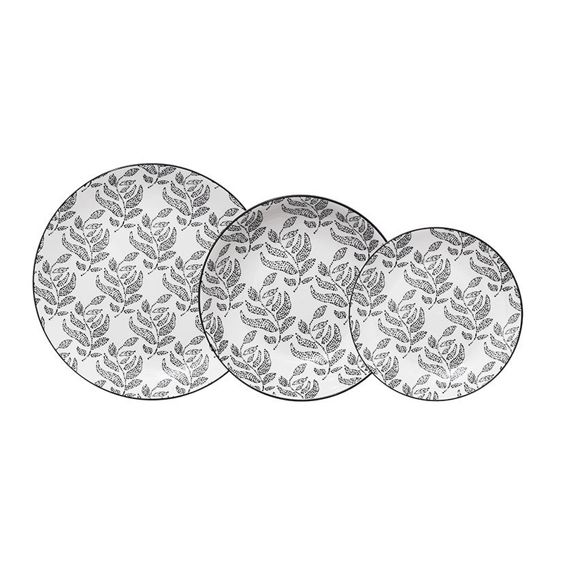 Esta vajilla está fabricada en porcelana con estampado de hojas en color gris con la técnica del puntilleado, dando un aspecto cotemporáneo y original a tu mesa. Se compone por 18 piezas: 6 platos hondos de 20 cm, 6 platos llanos 26,5 y 6 platos de postre 19 cm. Además, es apta para el microondas y la podrás lavar en el lavavajillas. Se sirve en una caja.