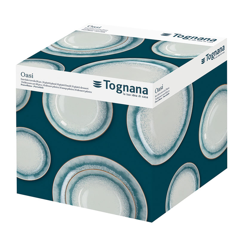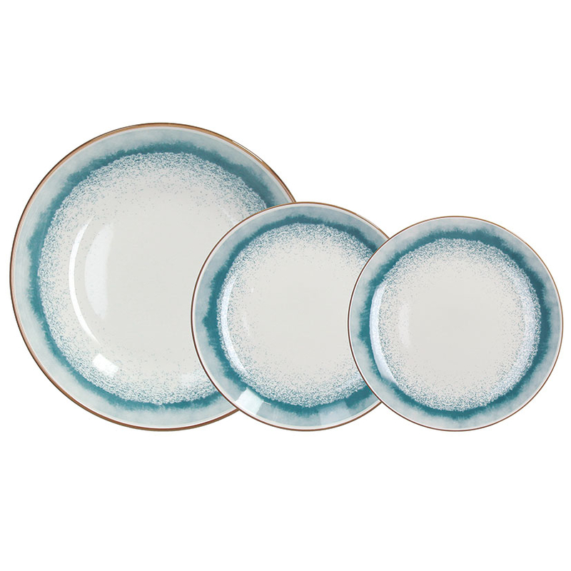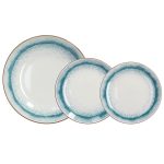Esta vajilla está fabricada en porcelana aporta un diseño personal. De inspiración en el oceano por sus tonos turquesas, combina perfectamente con cualquier estilo en la mesa, aportando una cierta elegancia al servicio. Ideal para un uso diario, restaurantes o como una idea de regalo. Se compone por 18 piezas: 6 platos hondos de 20,5 cm, 6 platos llanos de 27 cm y 6 platos de postre de 19 cm. Además, es apta para el microondas y la podrás lavar en el lavavajillas. Se sirve en una caja.