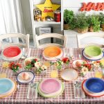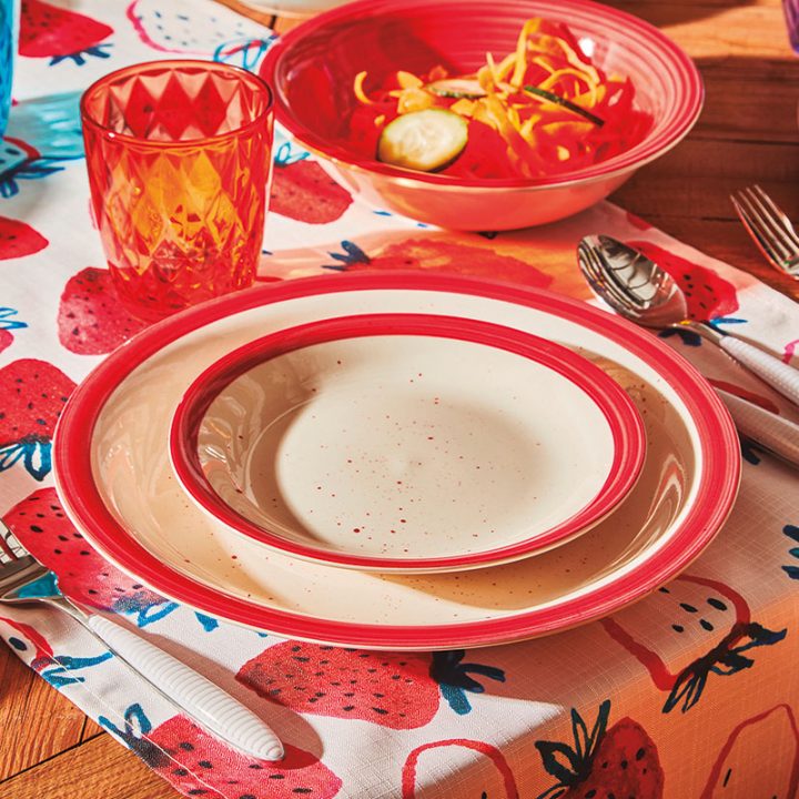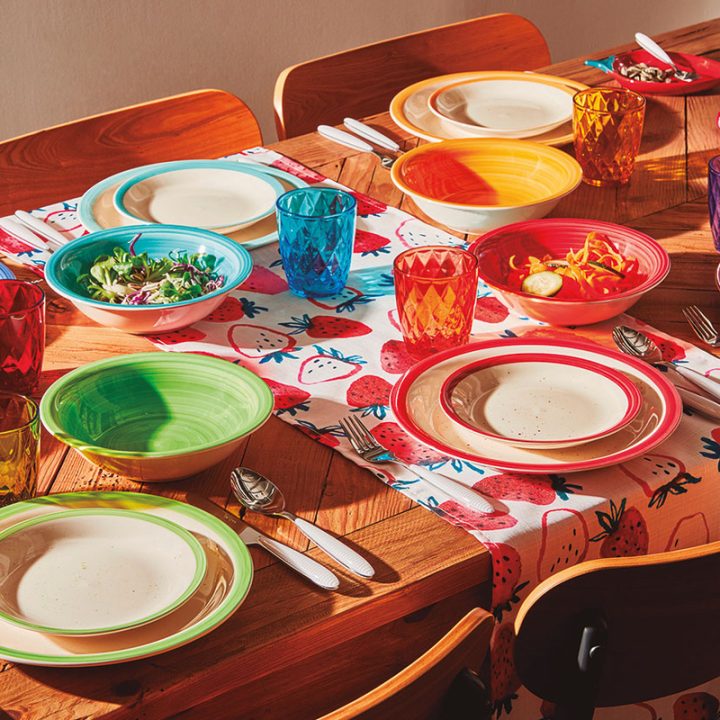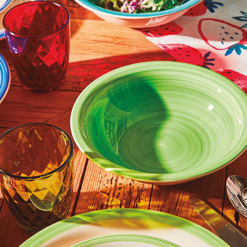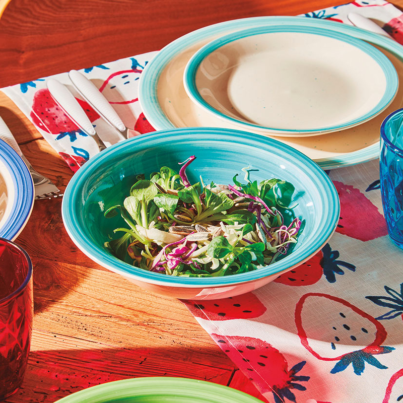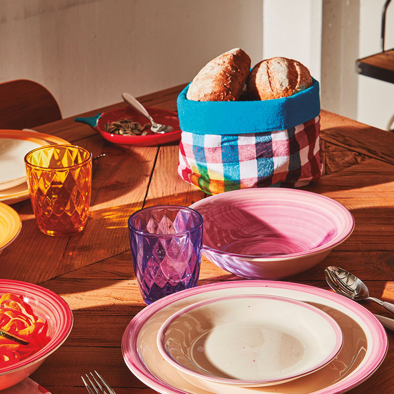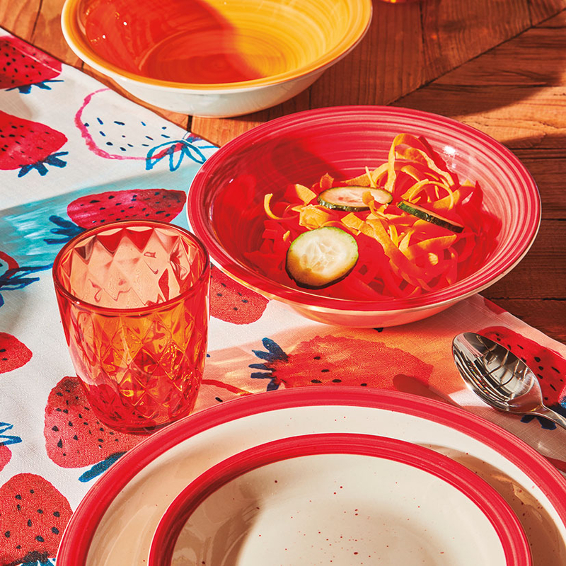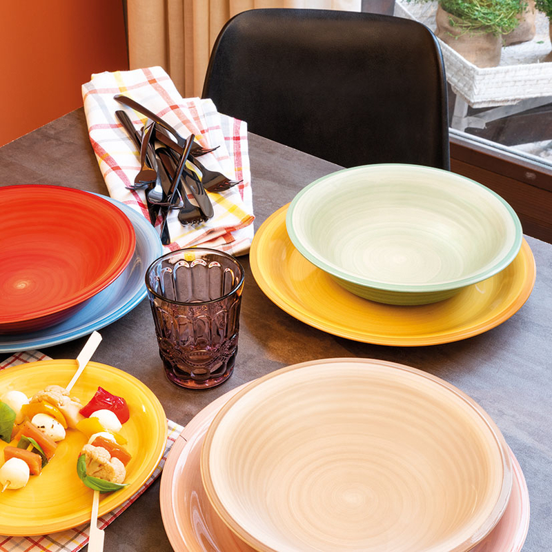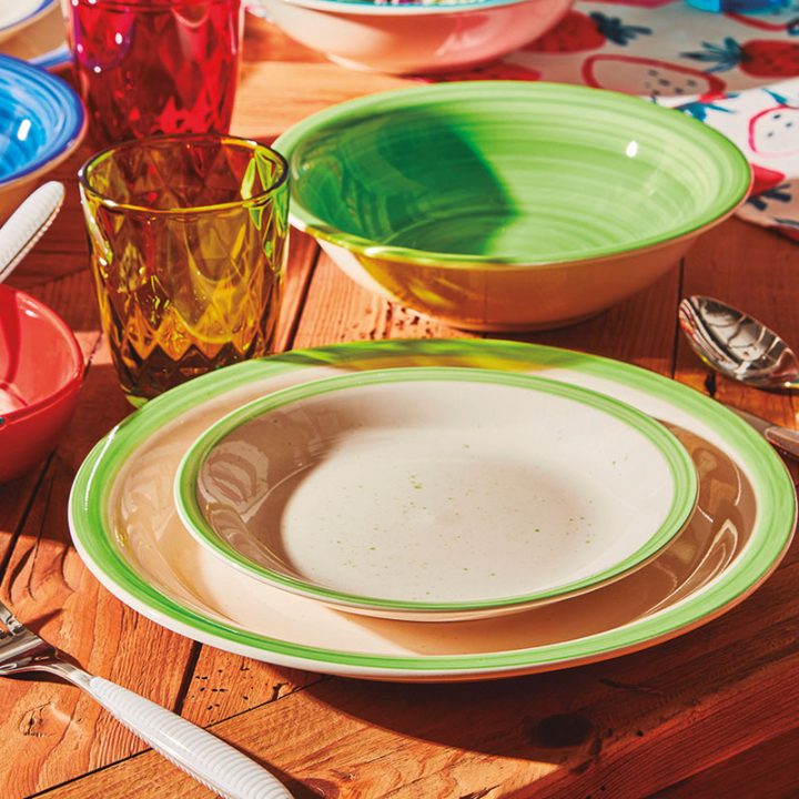 Esta vajilla está fabricada en porcelana en diferentes colores brillantes y alegres que se van combinando con los diferentes platos. Se compone por 18 piezas: 6 platos hondos de ø 21 cm, 6 platos llanos de ø 27 cm y 6 platos de postre de ø 19 cm. Además, es apta para el microondas y la podrás lavar en el lavavajillas. Se sirve en una caja.