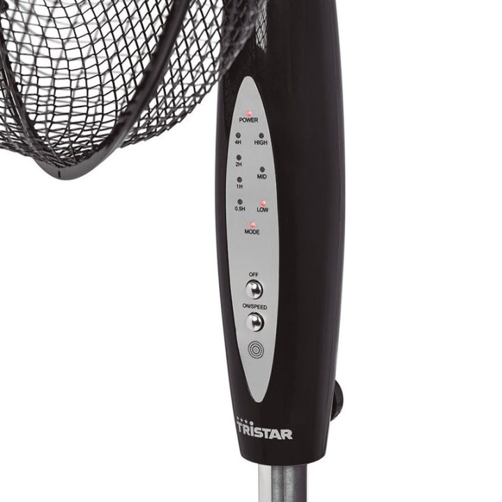 El ventilador de pie TRISTAR VE-5899 lo puedes ajustar en altura de 105 a 125 cm según necesitas y ajustar el flujo de aire para tu mayor confort (normal, natural y sueño). Tiene una oscilación de 85º y una fácil instalación, tiene un solo pie con un selector rotativo para apretar o aflojar las patas. De esta forma, podrás plegar las patas para guardar más fácilmente el ventilador. El temporizador se puede ajustar hasta 7,5 horas y disfrutar de la fresca brisa. Se presenta en una caja y tiene 3 años de garantía.