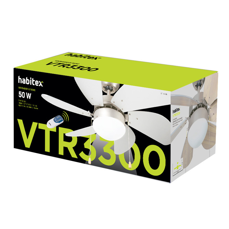 El ventilador HABITEX VTR de 50W de potencia está compuesto por 6 hélices bicolor y reversibles en madera/gris metalizado innovadoras y aerodinámicas, diseñadas para garantizar un caudal constante de aire fresco. Incluye 3 velocidades de funcionamiento para que puedas adaptarlo según necesites. Posee un doble sentido de giro de las aspas en verano/invierno. Incorpora una luz regulable que funciona con una lámpara E27 de 60W (no incluida) e incluye un mando a distancia (2 pilas AAA no incluidas) para que lo puedas manejar cómodamente. Viene presentado en caja y tiene 3 años de garantía.