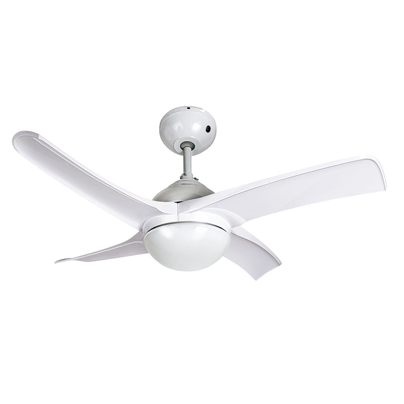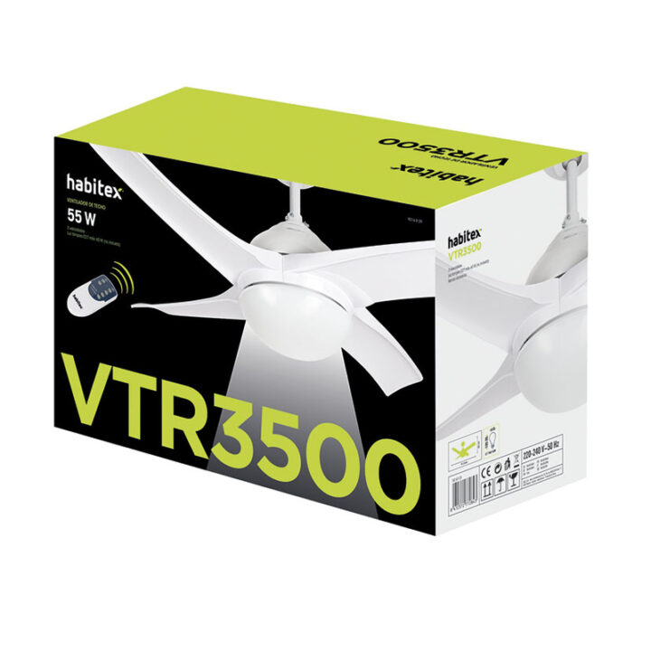 El ventilador de techo HABITEX VTR-3500 tiene una potencia de 55 W con 3 velocidades. Está equipado por un motor AC. Tiene 4 hélices que hacen un diámetro total 91 5 cm. Lo podrás instalar de una manera muy fácil en cualquier estancia. Con el mando a distancia que incorpora, te será más fácil manejarlo desde cualquier punto de la estancia. Una de las ventajas de los ventiladores de techo es que hacen de elemento decorativo en tu hogar y a la vez son saludables, ya que no provocan sequedad de garganta ni de ojos, ni resfriados debido a corrientes de aire excesivamente frías. Luz lámpara E27 máx 60W (no incluida). Viene presentado en caja y tiene 3 años de garantía. El mando a distancia funciona con 3 pilas AAA no incluidas.