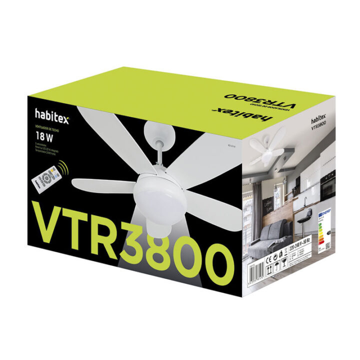 El ventilador HABITEX VTR 3800 está equipado por un motor silencioso DC de 18W de potencia está compuesto por 5 hélices reversibles en color blanco innovadoras y aerodinámicas, diseñadas para garantizar un caudal constante de aire fresco. Incluye 3 velocidades de funcionamiento para que puedas adaptarlo según necesites. Posee un doble sentido de giro de las aspas en verano/invierno. Incorpora un temporizador de 2/4/8 horas que podrás controlar gracias al mando a distancia que lleva incorporado el ventilador; un LED regulable a 3 modos: luz fría, neutra y cálida, así como la intensidad. Viene presentado en caja y tiene 3 años de garantía. En nuestra web disponemos de los recambios de luminaria y kits de emisor más receptor motor AC y DC.