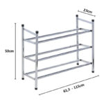 Este zapatero tiene una estructura metálica en color gris que se extiende adaptándose perfectamente a tu espacio. Tiene 3 alturas para colocar zapatos. Las dimensiones son 61 5/115x23xh.50 cm Viene presentado en caja. Puedes consultar el croquis que tenemos colgado en nuestra web.